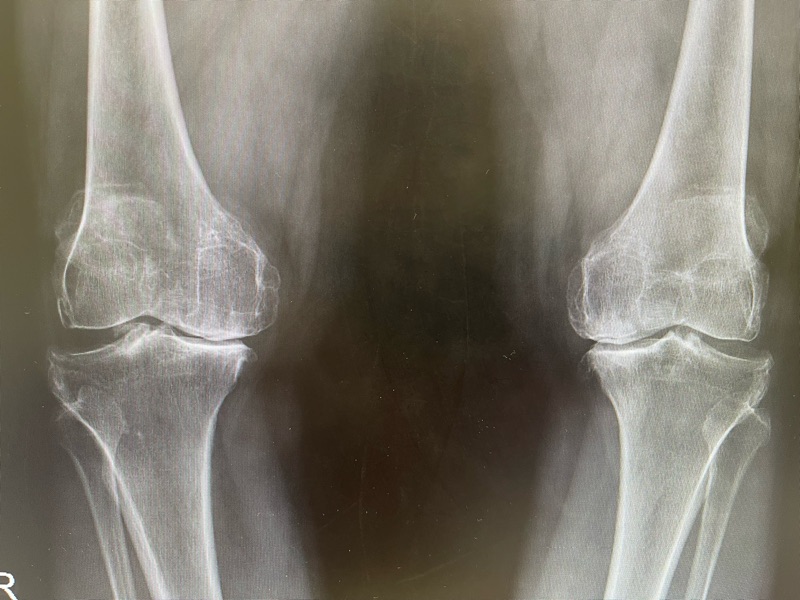 - เอกซเรย์เห็นว่าข้อเข่าเสื่อมรุนแรง ผิวข้อหายไปเกือบหมด